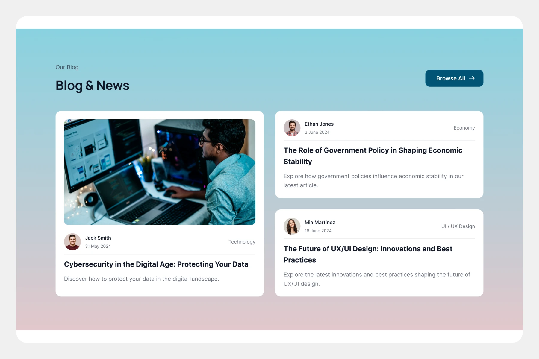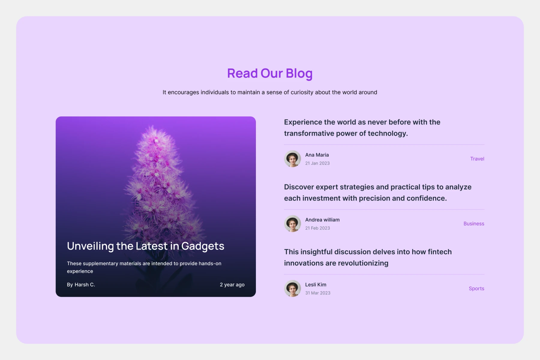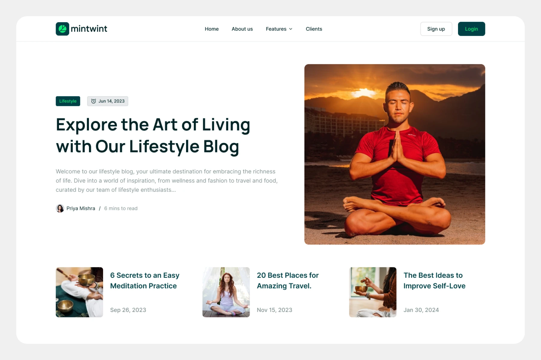 Modern card-based blog layout, clean headline, left-aligned text, rounded corners, lifestyle tag, date badges, author avatar.