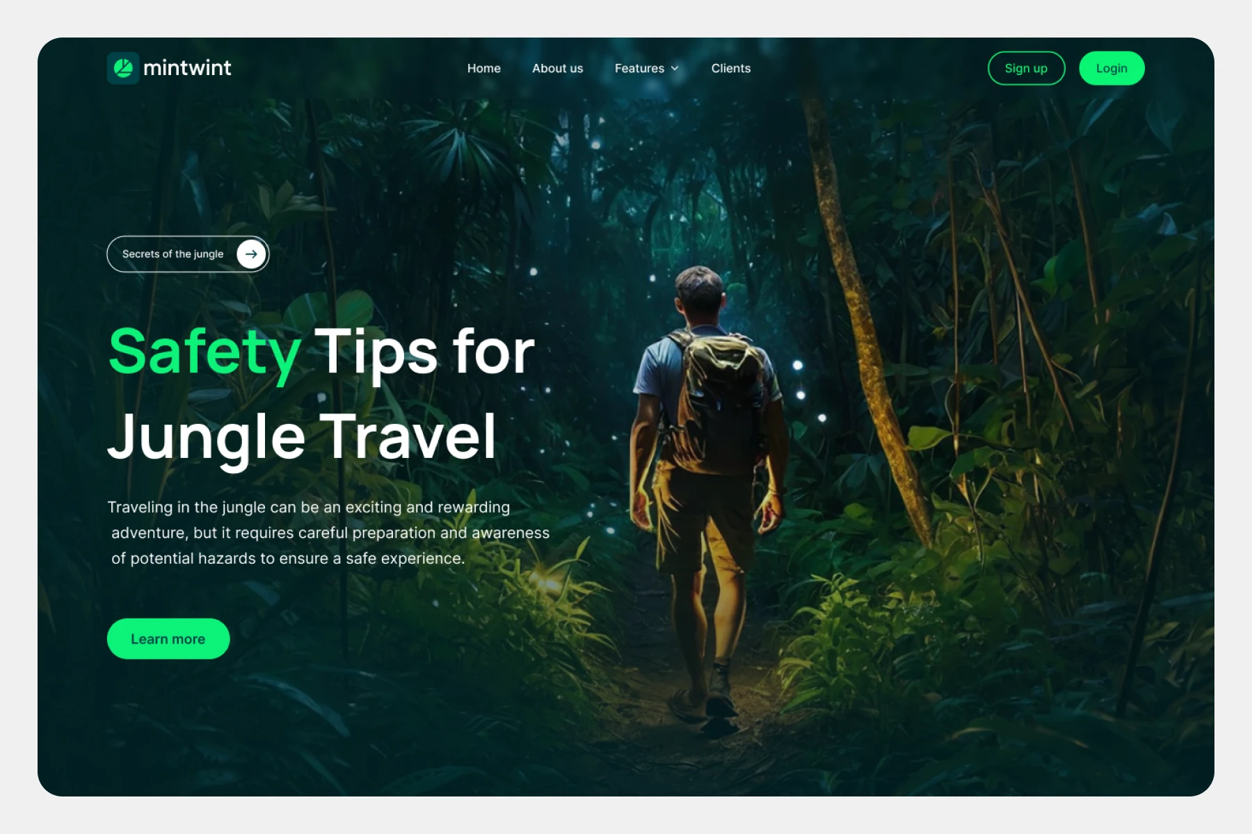 Immersive dark jungle theme, bold headline, green accent, rounded buttons, overlay text, translucent navbar, ambient glowing dots.