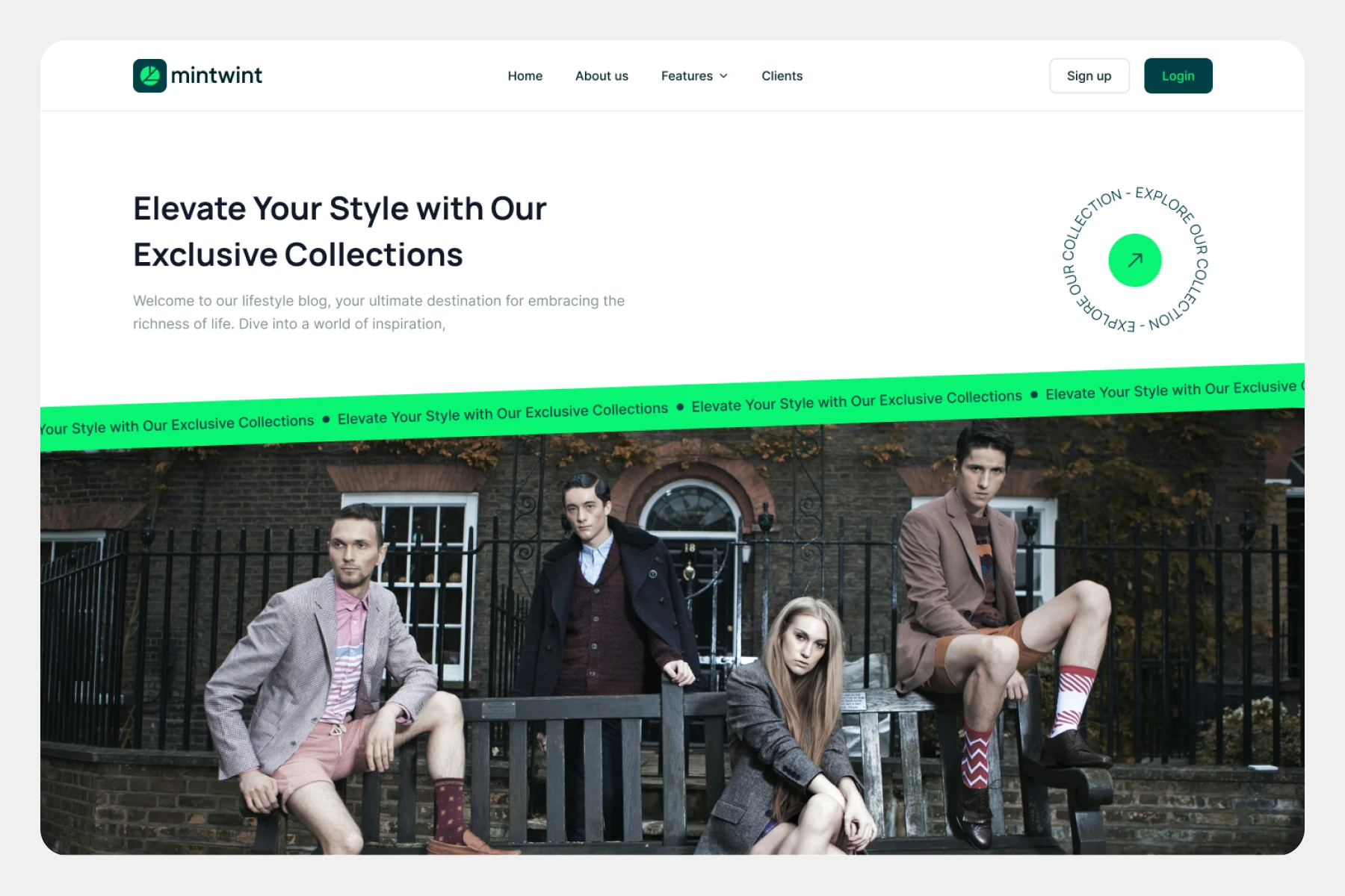 Bold headline, circular arrow CTA, modern editorial fashion photo, angled neon green ticker, minimal top navigation, spacious white background