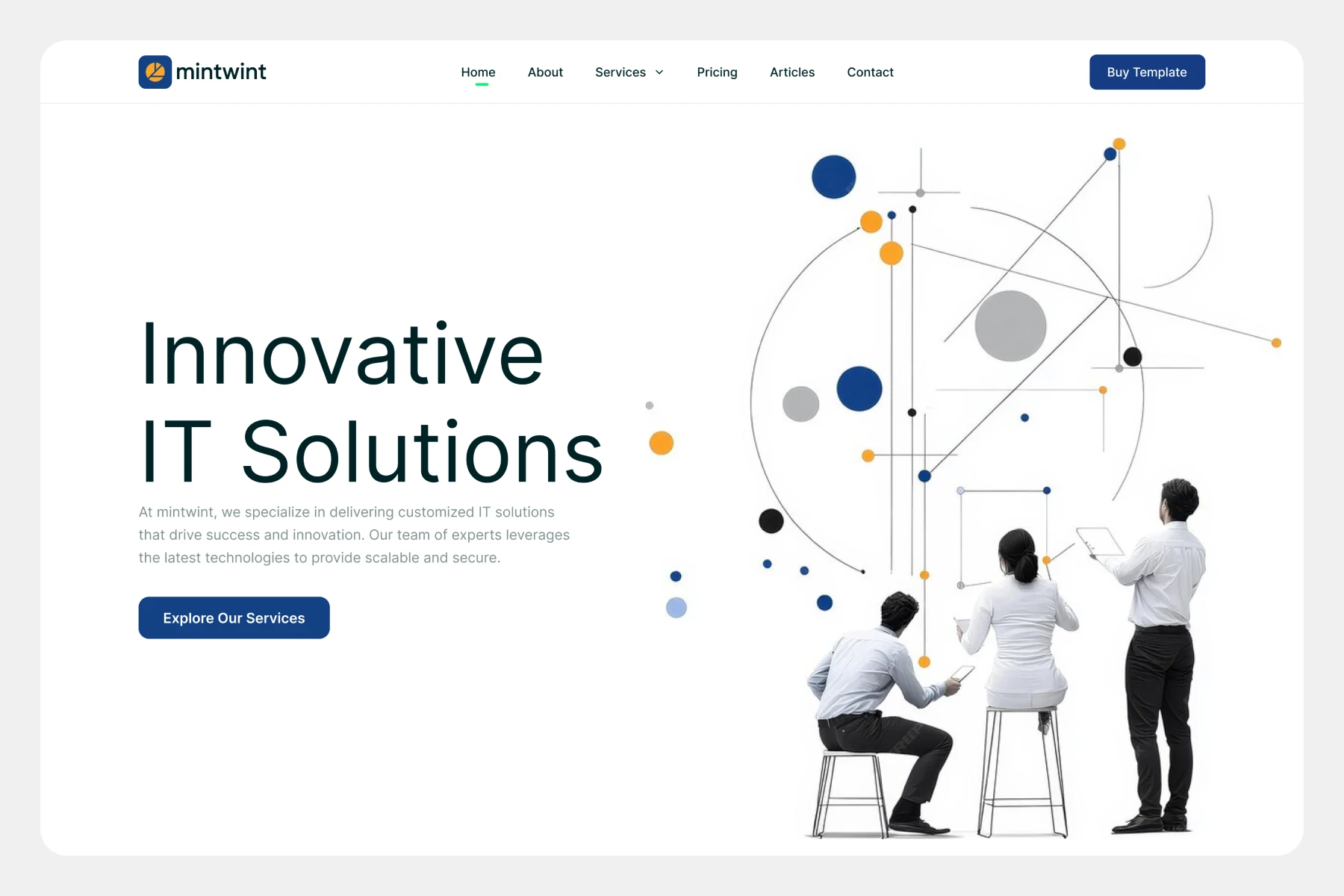 Minimal white background, bold typography, geometric abstract illustration, blue and amber accent dots, simple top navigation, clear CTA button.