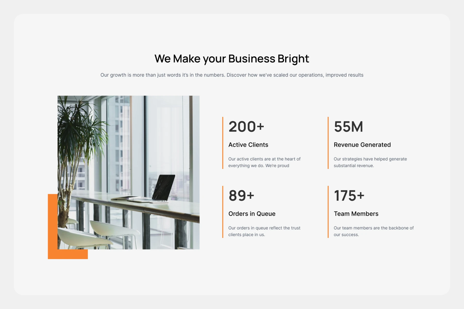 Darkened photo overlay background, bold white stats, orange circular icons, horizontal alignment.